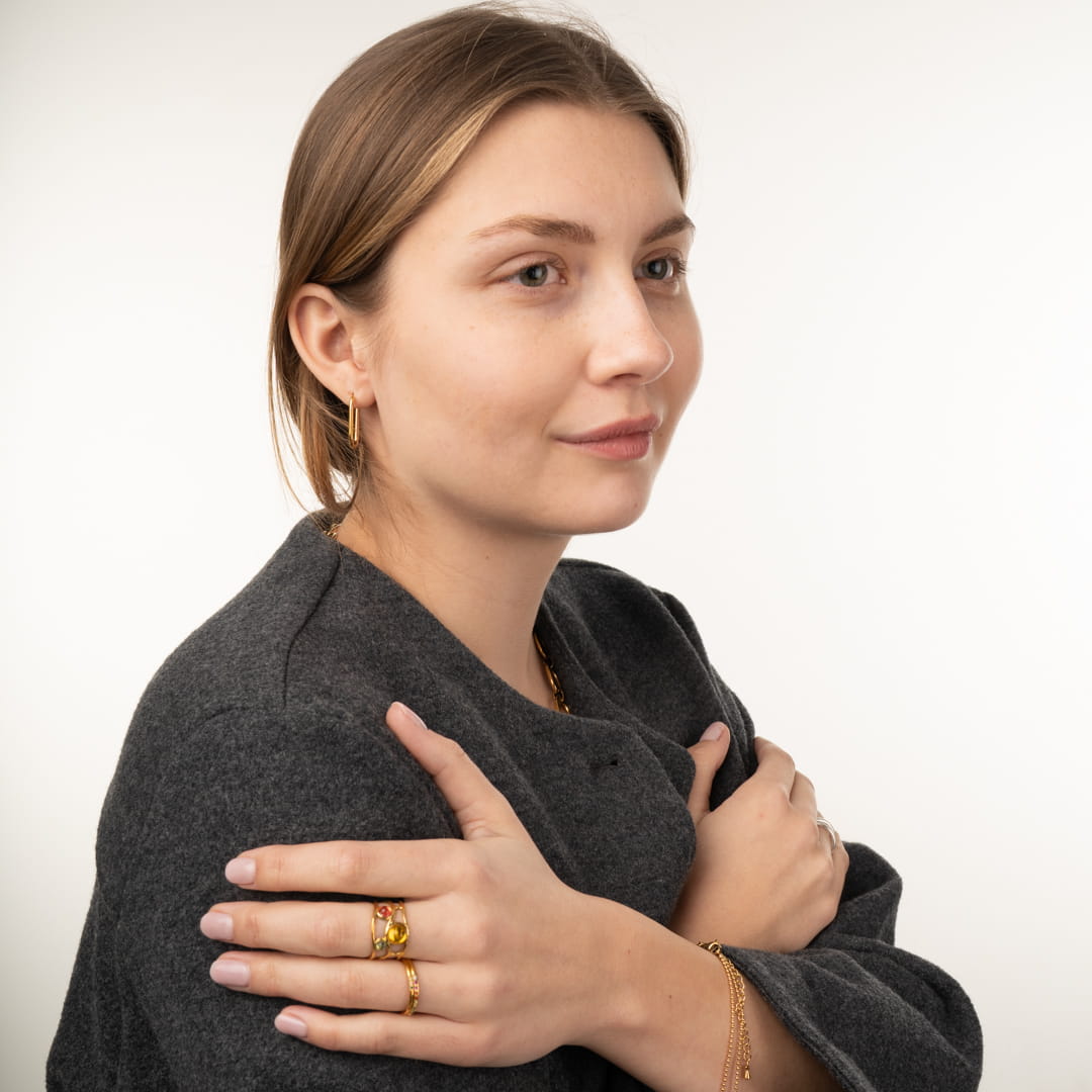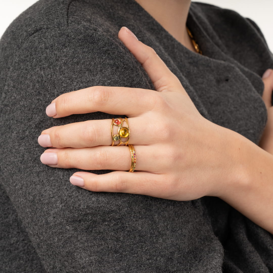 Die drei Farben stehen für die Vielfalt der Natur: Das Gelb der Sonne, das Rot der Blüten und das Grün der Blätter. Die unregelmässige, organische Form des Goldes soll zeigen, dass wahre Schönheit oft in der Unvollkommenheit und im freien Fluss liegt – genau wie in der Natur, wo kein Zweig dem anderen gleicht. Der Aurora ist für die Frau gedacht, die ihre verspielte Seite liebt und sich traut, Farbe zu bekennen. Er soll dich daran erinnern, dass das Leben bunt ist und es sich lohnt, jeden Tag in seiner vollen Pracht zu “erblühen“. Ein kleiner Reminder an deinem Finger, dass du dein eigenes Strahlen überallhin mitnimmst.