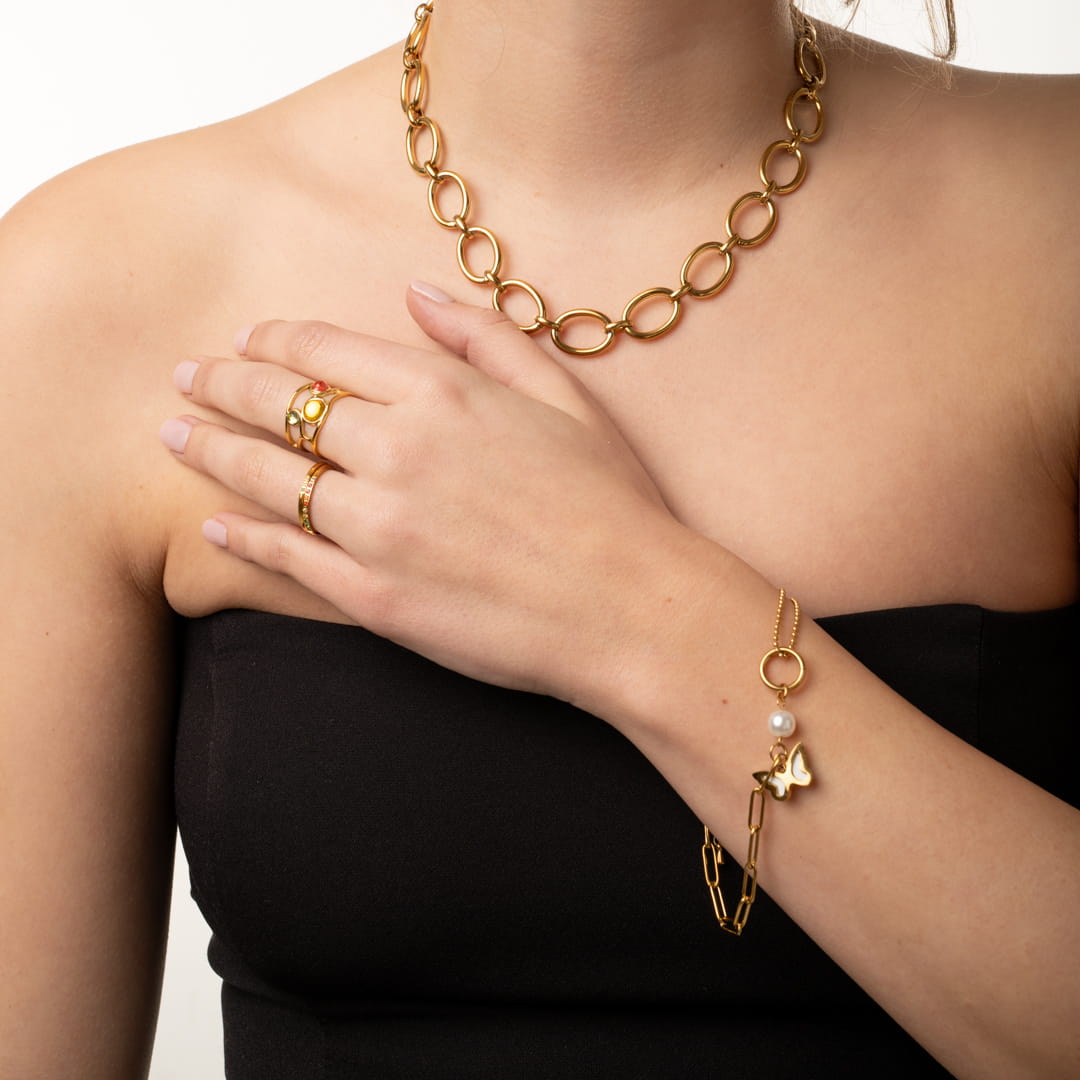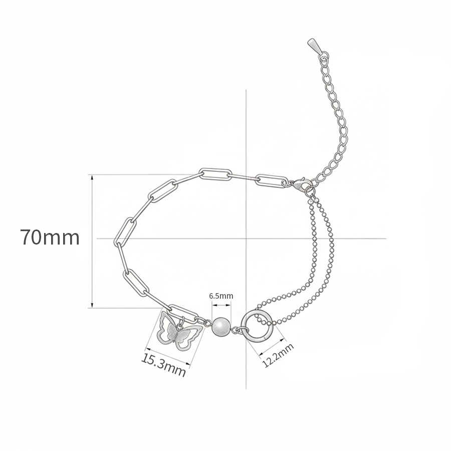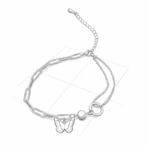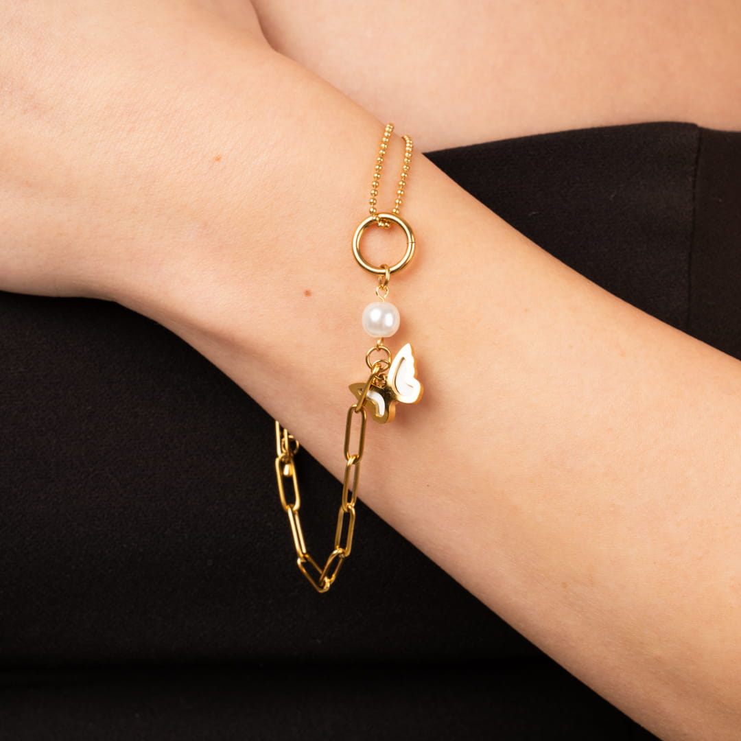 Was dieses Stück besonders macht Dieses Armband ist kein Standard – es ist ein Statement. Auf der einen Seite hast du markante, moderne Chain-Links, auf der anderen eine filigrane Kugelkette. Verbunden werden diese beiden Welten durch einen goldenen Ring, an dem eine schimmernde weisse Perle und ein detailreicher Schmetterling hängen. Trotz des verspielten.