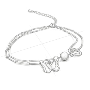 Wir wollten ein Schmuckstück entwerfen, das die Balance zwischen Stärke und Zartheit hält. Die grobe Kette steht für die Kraft, die Kugelkette und die Perle für die sanfte Seite. Der Schmetterling ist für uns das Symbol für Transformation – er zeigt, dass man sich ständig neu erfinden kann.