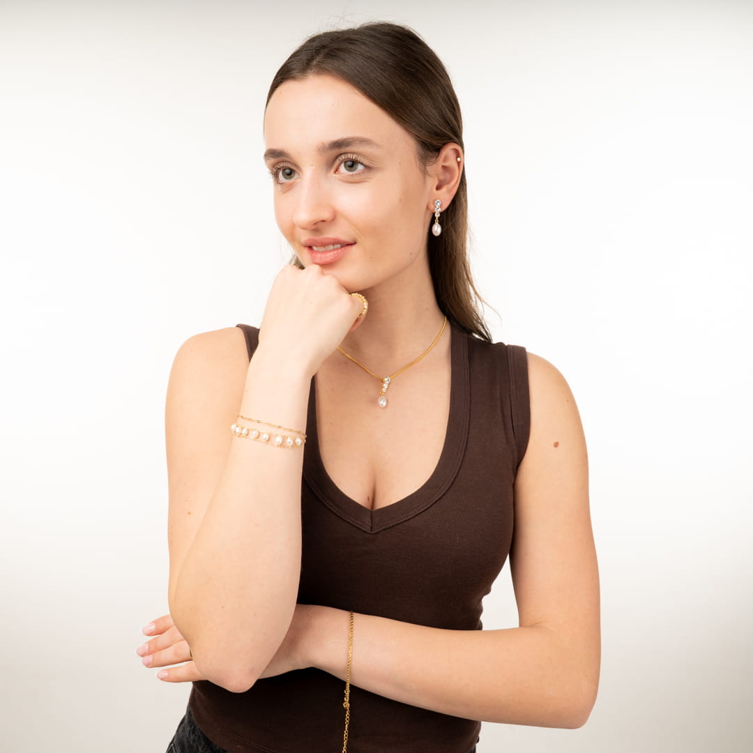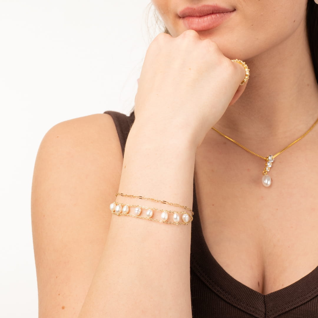 Wir wollten ein Schmuckstück, das sich anfühlt wie ein Sommertag am See – leicht, glitzernd und unkompliziert. Die Kombination aus Gold und Weiss ist ein Klassiker, aber durch die zwei Reihen bekommt das Armband einen modernen Twist.