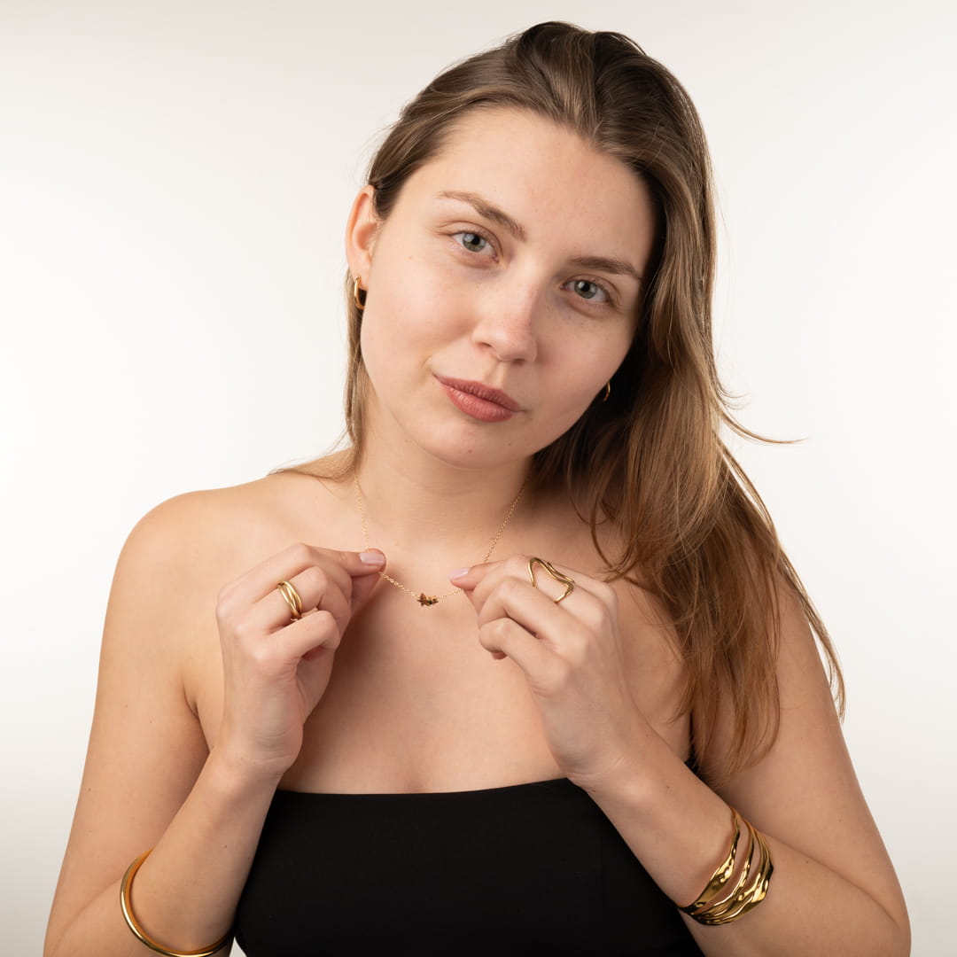 Lyra Stellar Duo Halskette verbindet modernes Design mit zeitloser Eleganz und lässt sich sowohl im Alltag als auch zu besonderen Momenten tragen.