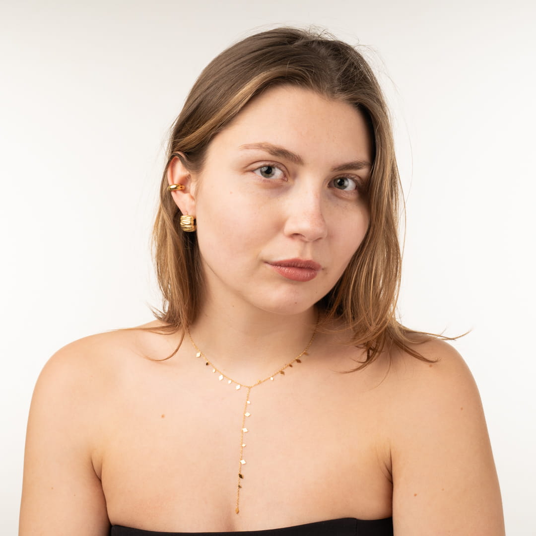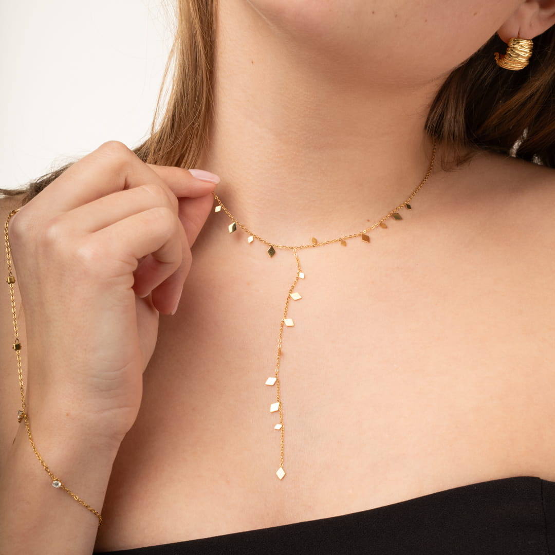 Ein goldener Regen aus purer Eleganz: Die Seraphina Rhombus Drop besticht durch ihre verführerische Y-Form und eine Vielzahl filigraner Rauten-Anhänger. Ein Schmuckstück, das jede deiner Bewegungen in ein funkelndes Lichtspiel verwandelt und dein Dekolleté kunstvoll in Szene setzt.