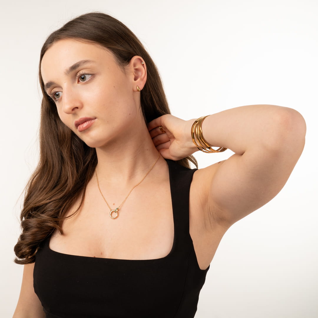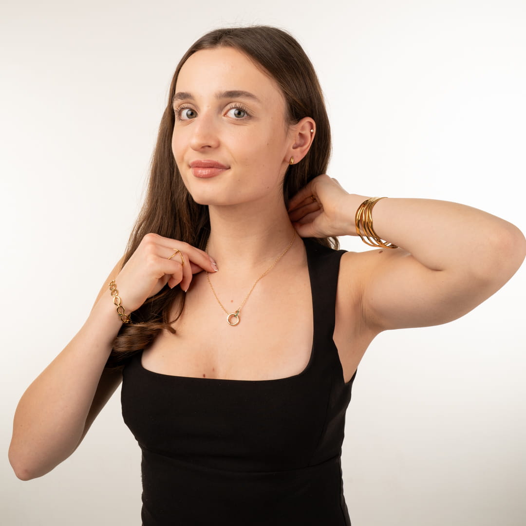 Die ineinander verschlungenen Ringe symbolisieren den Halt, den wir in uns selbst und in unseren wichtigsten Beziehungen finden. Jedes Mal, wenn du diese Kette anlegst, soll sie dich an deine innere Stärke und die Verbindungen erinnern, die dein Leben bereichern. Es ist ein Design für Frauen, die fest im Leben stehen und ihre Ziele mit Anmut verfolgen. Ein kleines Stück Naturmagie, eingefangen in modernem Gold, das dich daran erinnert, dass wahre Beständigkeit oft in der Verbindung liegt.